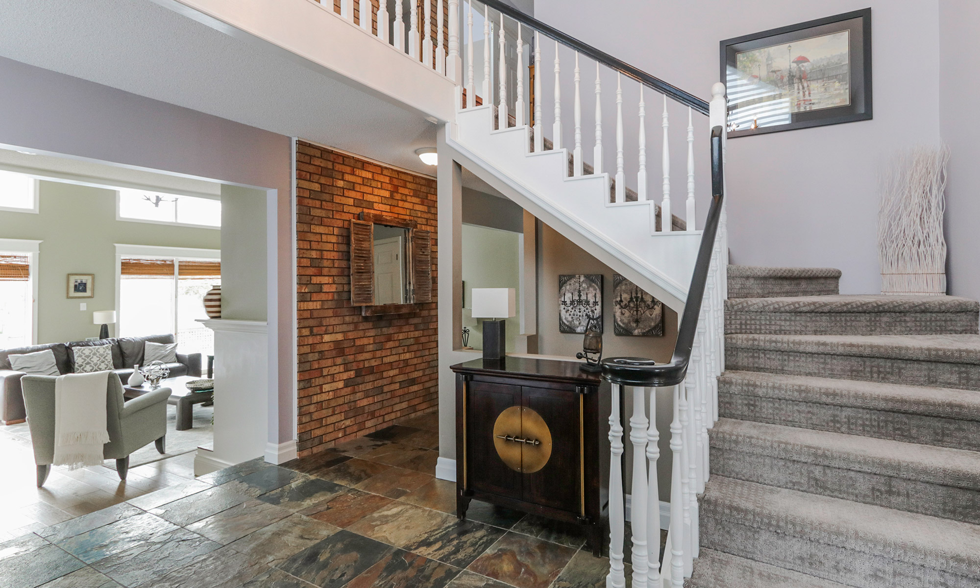 Foyer with stairs overlooking family room